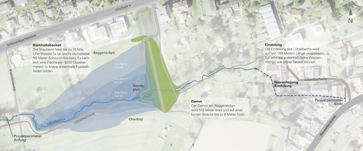 Aktuell noch unzureichend gesichert ist der Lützelbach. Wie schnell das unscheinbare Bächlein über seine Ufer treten kann, zeigte sich letztmals Mitte 2018. In diesem Teilprojekt sorgte vor allem die Standortfrage für ein Rückhaltebecken für Verzögerung. Die zunächst gewählte Stelle hat sich als ungeeignet erwiesen. 2010 beschloss die Gemeinde Allschwil, in einem Variantenstudium nach Alternativen zu suchen. Der Kanton folgte der Empfehlung einer Arbeitsgruppe, den Damm am Beggenecken (auf der Höhe des Judengässli zwischen Schönenbuchstrasse und Lützelbach) als Bestvariante zu realisieren. Die Vorzüge dieses Standorts bestätigten sich 2017 in detaillierten Bodenanalysen.