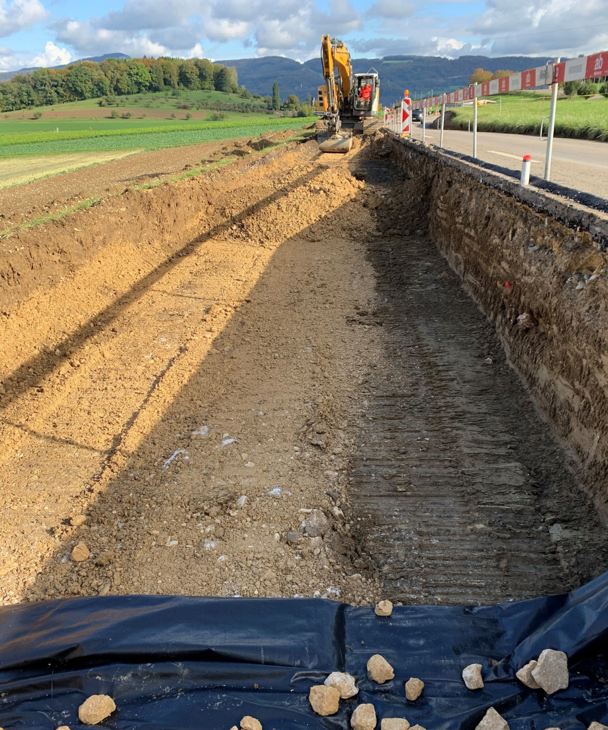 Neben dem Rückhaltebecken umfasst das Hochwasserschutz-Projekt eine Querschnittsvergrösserung des unteren, eingedolten Bachlaufs. Die Kapazität der aktuell verbauten Röhren reicht nicht aus, um bei Starkregen die notwendige Wassermenge abführen zu können. Da es die Situation vor Ort verunmöglicht, den Bach freizulegen, werden grössere Rohre verlegt. Die Linienführung nimmt Rücksicht auf die bestehenden Infrastrukturen und die Bedürfnisse der Anwohnerinnen und Anwohner.