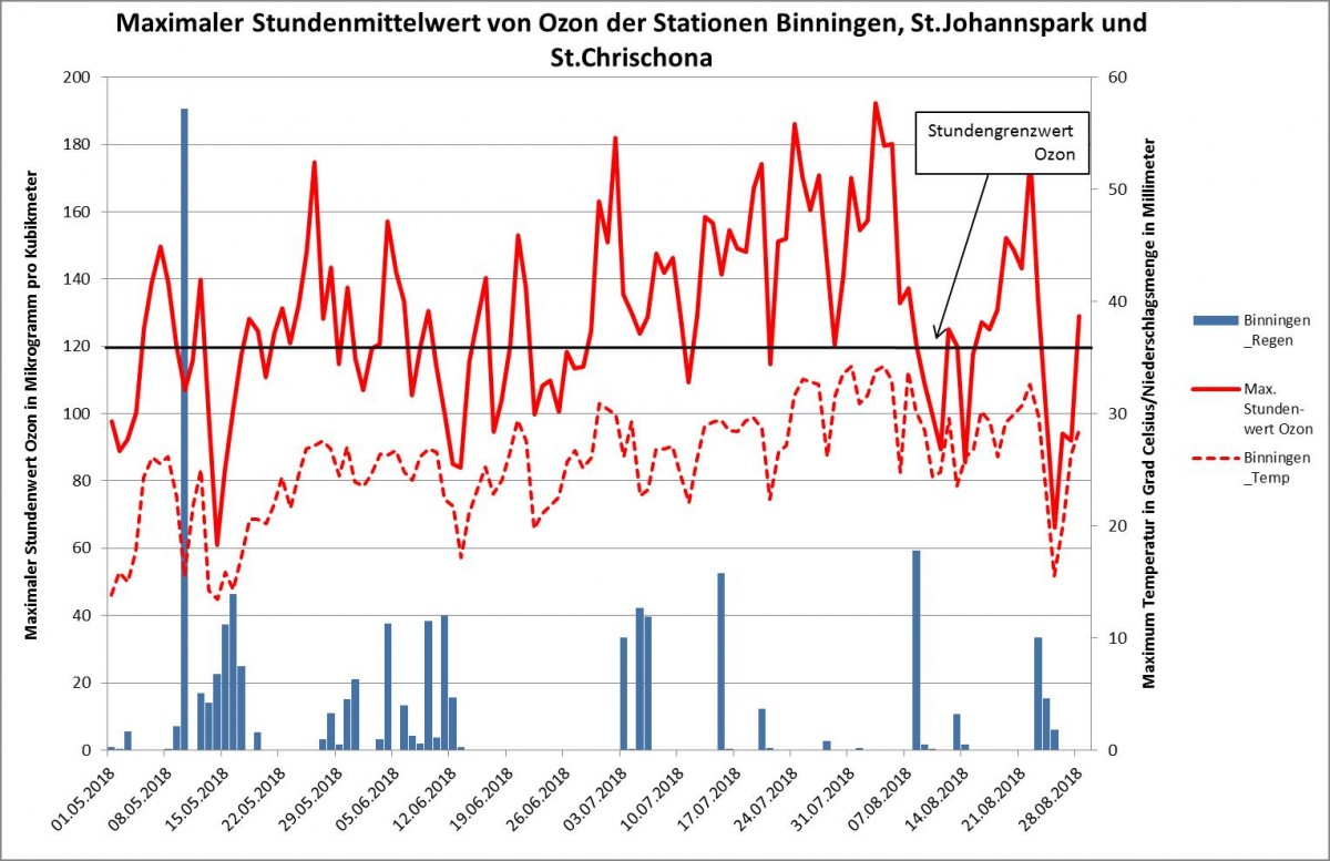 Der diesjährige heisse und sonnige Sommer ist geprägt von einer hohen Ozonbelastung in der gesamten Region Basel. Angefangen mit angenehmen frühsommerlichen Temperaturen im Mai, stieg die Temperatur während des Sommers kontinuierlich an. Vor allem im Juli und Anfang August summierten sich die Hitzetage. Vom 13. Juli bis 8. August wurden an der Station Binningen 14 Tage und an der Station St. Johann in Basel sogar 26 Tage mit einer maximalen Temperatur von über 30 Grad gemessen. Damit ist ein deutlicher Anstieg der Ozonbelastung verbunden.