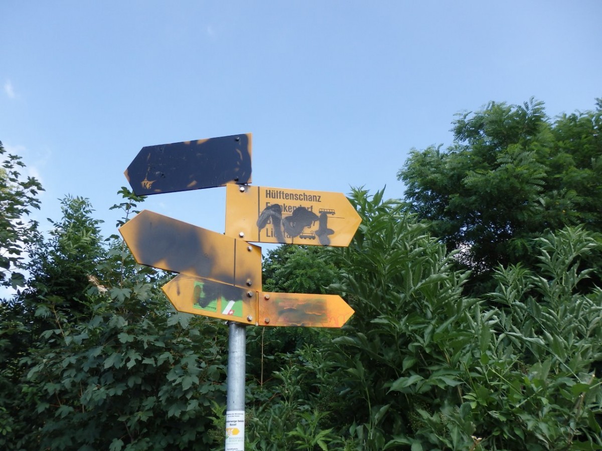 Der versprayte Wegweiser im Gebiet Hülftenschanz konnte nicht mehr gereinigt werden. (Quelle: ARP)