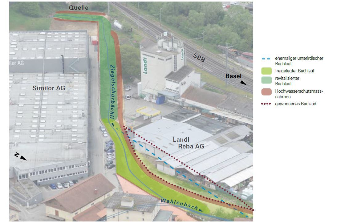 Dem Kanton Basel-Landschaft bot sich gleichzeitig die Chance, die raumplanerischen Verhältnisse am Ziegelschürbächli zu bereinigen. Zudem verfolgt er die Strategie, Hochwasserschutz und Arealentwicklung auch unter dem Gesichtspunkt der Revitalisierung zu planen.