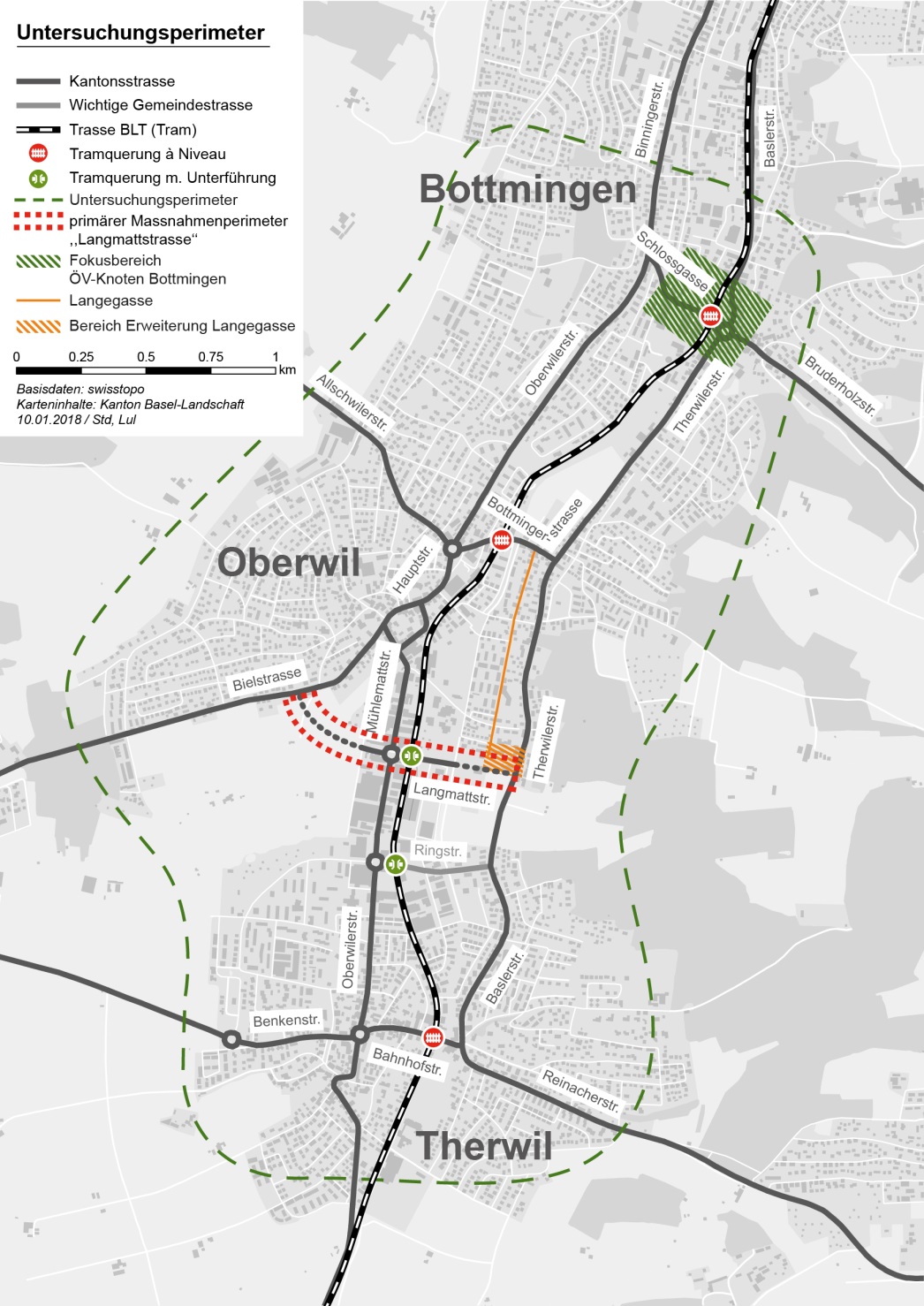 Zum Projekt: Das Leimental wird durch zwei parallel verlaufende Kantonsstrassenachsen in Nord-Süd-Richtung erschlossen. Um die Talseiten zu wechseln stehen diverse Strassenverbindungen zur Verfügung. Im Bereich der Gemeinden Oberwil und Therwil befinden sich auf den Querungen im Kantonsstrassennetz (Bahnhofstrasse in Therwil und Bottmingerstrasse in Oberwil) à-Niveau-Übergänge der BLT-Tramlinie. Einzig die dritte Querverbindung, die kommunale Ringstrasse in Therwil, ist niveaufrei. Aufgrund des hohen Verkehrsaufkommens und der in den Spitzenstunden häufig geschlossenen Barrieren, nehmen im Bereich der à-Niveau-Übergänge der Kantonsstrassen in den Ortszentren Oberwil und Therwil die verkehrlichen Probleme zu. Verkehrsteilnehmende entscheiden oft nach aktueller Verkehrssituation, auf welcher Strasse sie die BLT-Tramlinie queren wollen. Dabei weichen sie auch auf die attraktive Route via kommunale Ringstrasse aus. Mit der verlängerten Langmattstrasse soll eine neue Kantonsstrasse das Tal und die BLT-Linie niveaufrei queren, damit die Ringstrasse entlastet und eine Alternative für die Tramübergänge in den Ortszentren entstehen kann. Das Gewerbegebiet Mühlematt erhält gleichzeitig einen besseren Anschluss in Richtung A18 und Birstal.