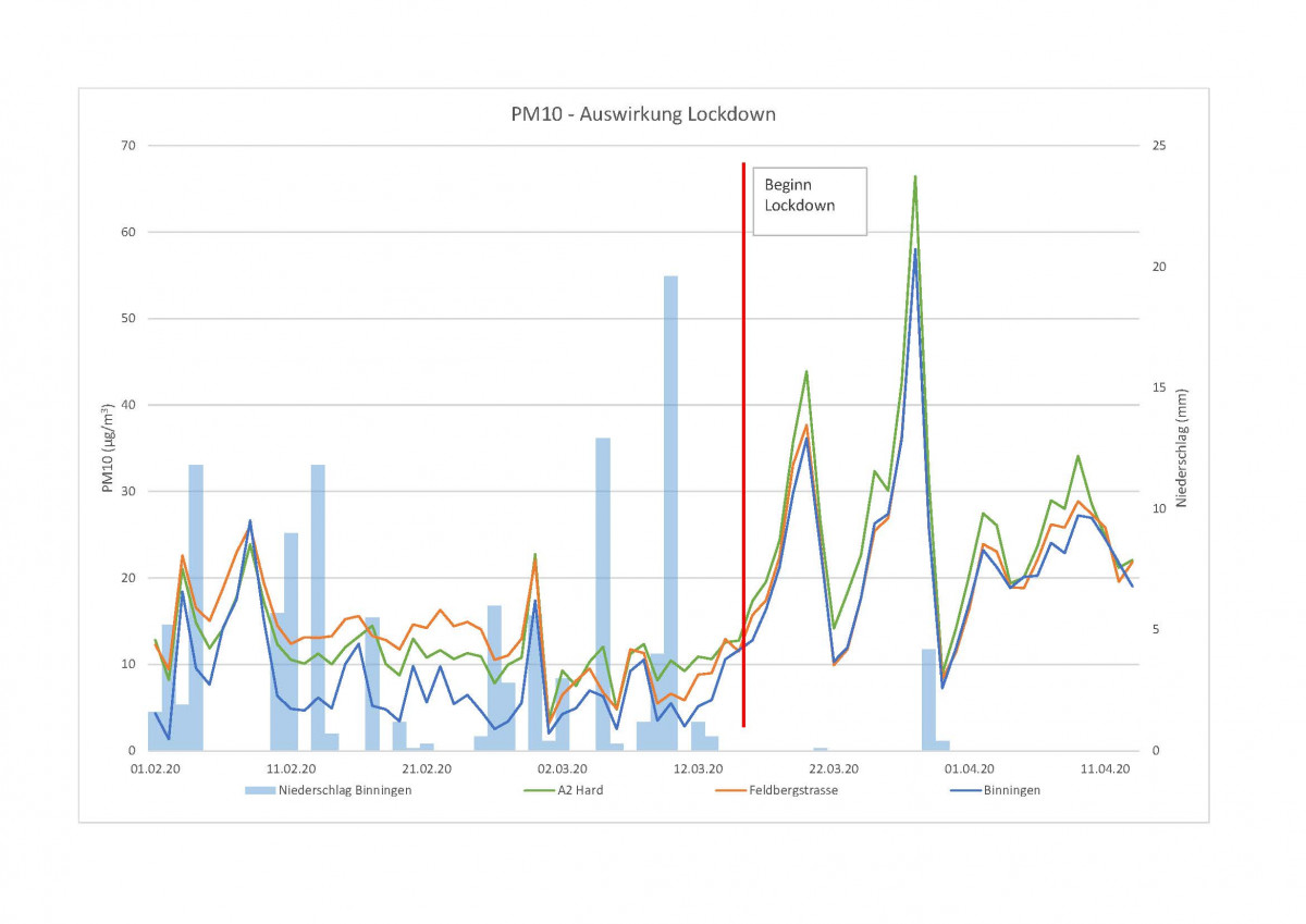 Die Luftmessungen ergaben einen Rückgang der Stickoxid-, gleichzeitig aber eine Erhöhung der Feinstaub-Immissionen. Die Stickoxide (NOx) sind seit dem 16. März 2020 vor allem an den verkehrsreichen Standorten gesunken. An der Messstation der Autobahn A2 im Hardwald ist im Vergleich zum Monat vor dem Lockdown ein Rückgang um 37 Prozent zu verzeichnen (Durchschnitt Tagesmittelwert (TMW) NOx vom 16. Februar bis 15. März: 70 µg/m3, Durchschnitt TMW NOx vom 16. März bis 13. April: 44 µg/m3).