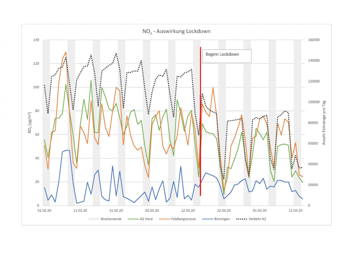 In Basel ist der Rückgang an der Feldbergstrasse mit sieben Prozent weniger ausgeprägt (Durchschnitt Tagesmittelwert (TMW) NOx vom 16. Februar bis 15. März: 61 µg/m3, Durchschnitt TMW NOx vom 16. März bis 13. April: 57 µg/m3). Dies kann einerseits mit den unterschiedlichen Verkehrszahlen begründet werden. Auf der A2 gab es einen Rückgang von rund 120'000 Fahrzeugen pro Tag auf zirka 70'000 Fahrzeuge pro Tag. Dies entspricht einer Abnahme von rund 40 Prozent. Der Anteil der LKW auf der Autobahn A2 betrug vor dem Lockdown gut sechs Prozent und stieg durch die Abnahme des Freizeitverkehrs auf rund acht Prozent an. Im Vergleich dazu die Feldbergstrasse in Basel: Von 11'000 Fahrzeugen pro Tag auf rund 8'000 Fahrzeuge pro Tag, was einem Rückgang von rund 25 Prozent entspricht.
