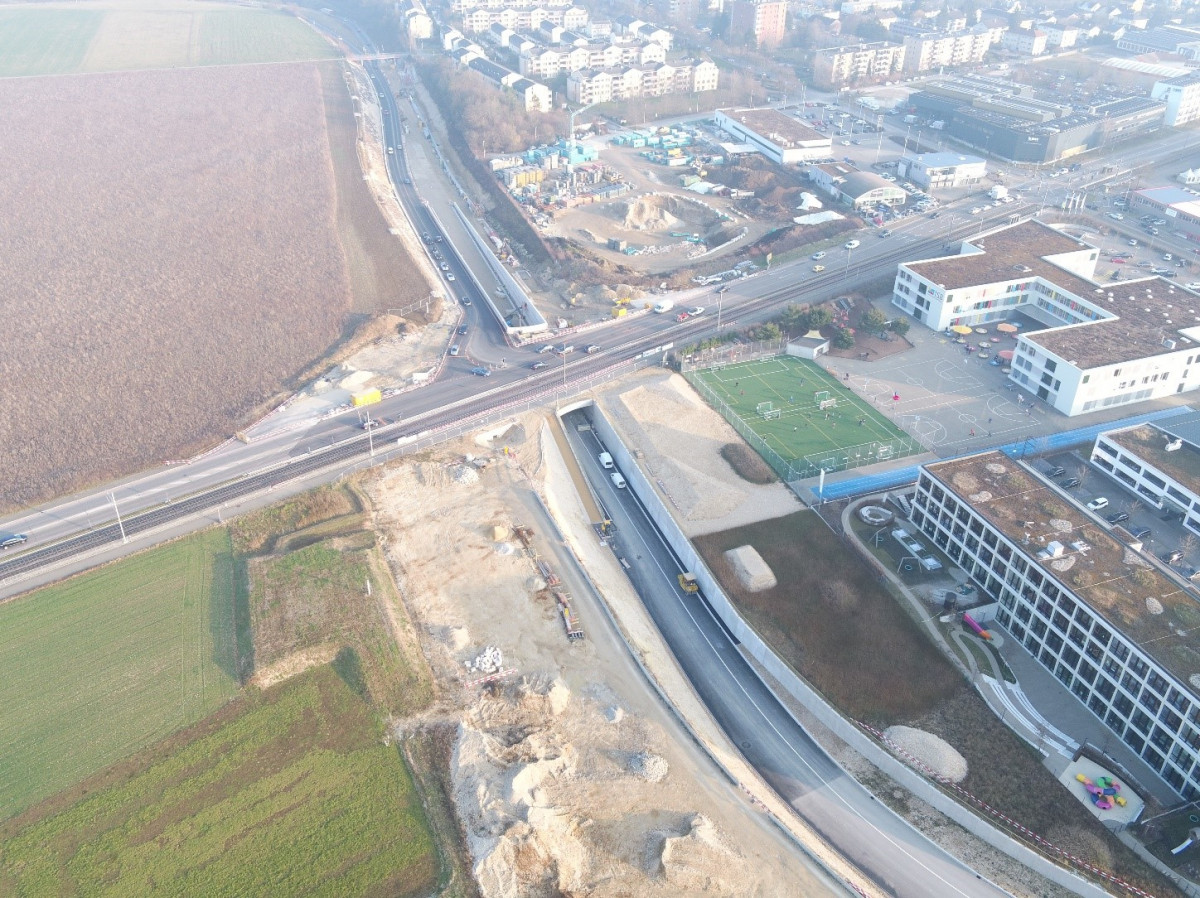 Luftbildaufnahme der Baustelle (Februar 2020) kurz vor Eröffnung der Unterführung für den Verkehr (Quelle: TBA).