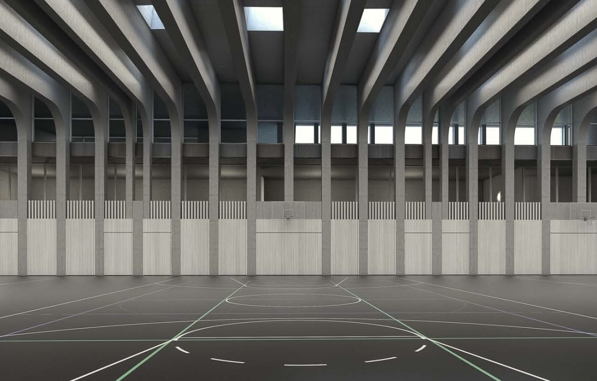 Im Sockel- und den Untergeschossen befinden sich vor allem die Dreifachsporthalle, der Gymnastik- und Kraftraum, die Garderoben, die Küche und der Mensabereich sowie die Technik- und Lagerräume.