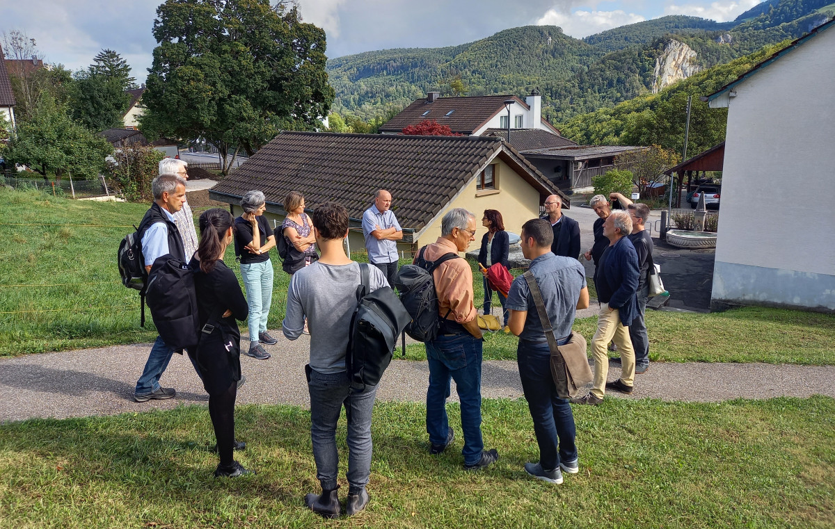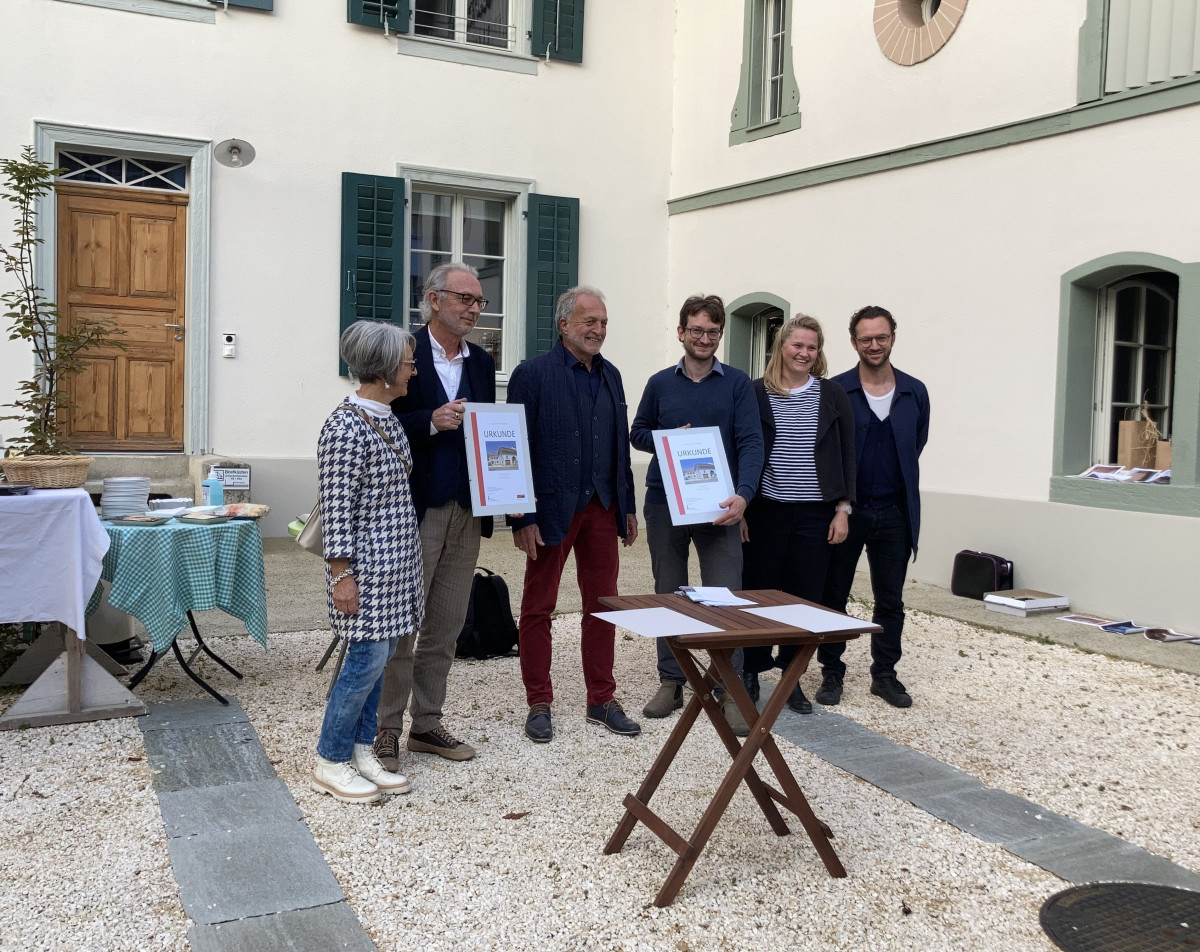 v.l.n.r. Das Eigentümer-Ehepaar Marianne und Markus Ruggli, Ruedi Riesen (Präsident des Baselbieter Heimatschutz), Lukas Ruggli sowie Andrea Schenk und Sébastien Richard von LUX Architekten (Quelle: ARP)