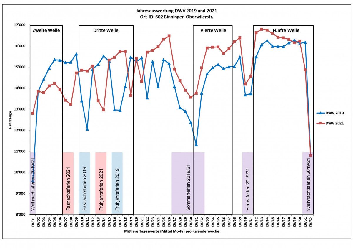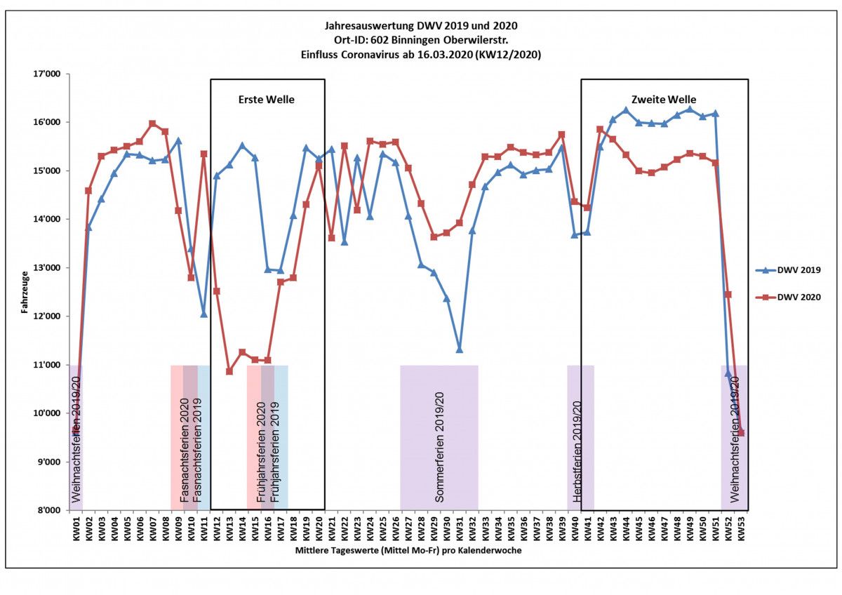 In den nachfolgenden Grafiken wird anhand der Jahresganglinie des durchschnittlichen Wochenverkehrs (DWV) an der Dauerzählstelle Oberwilerstrasse in Binningen der Effekt der Massnahmen gegen die Ausbreitung der Covid-19-Pandemie exemplarisch aufgezeigt. Es gilt zu beachten, dass es sich um effektive Zählwerte handelt, die auch im Einfluss von Baustellen und anderen Störungsfällen stehen können.