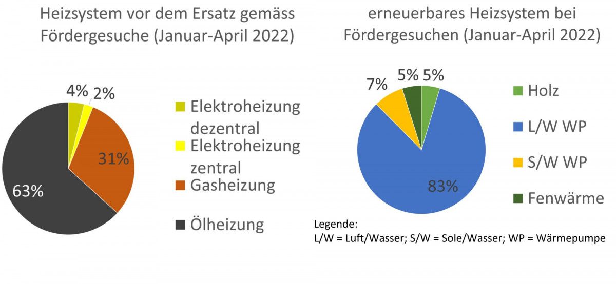 Der Blick auf die kumulierte Anzahl Fördergesuche für einen Heizungsersatz zeigt seit Februar 2022 einen starken Anstieg. Im Vergleich zum Vorjahr ist das Niveau der kumulierten Anzahl Gesuche bis und mit April um 17 Prozent höher und beträgt insgesamt mehr als 410 Fördergesuche. Ein genauerer Blick verrät, dass in 83 Prozent der Gesuche ein Umstieg auf eine Luft/Wasser Wärmepumpe geplant wird. Sieben Prozent beabsichtigen die Installation einer Sole/Wasser Wärmepumpe und jeweils fünf Prozent den Umstieg auf eine Holzfeuerung oder auf Fernwärme. Vor dem Heizungsersatz war in den meisten Fällen eine Ölheizung (63 Prozent) oder eine Gasheizung (31 Prozent) installiert und nur in sechs Prozent der Fälle wurde eine Elektroheizung ersetzt.
