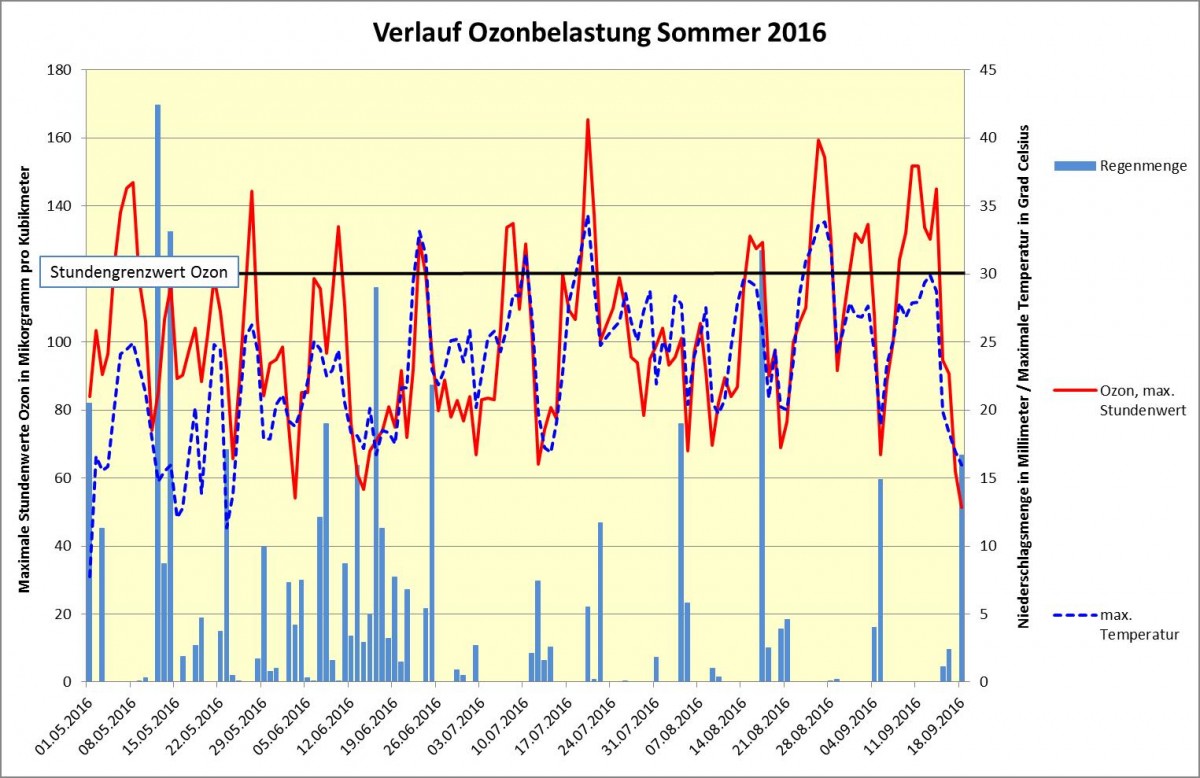 Der Verlauf der Ozonbelastung, sowie der Temperatur und der Regenmenge im Sommer 2016 (bis 18.9.2016). (Quelle: LHA)