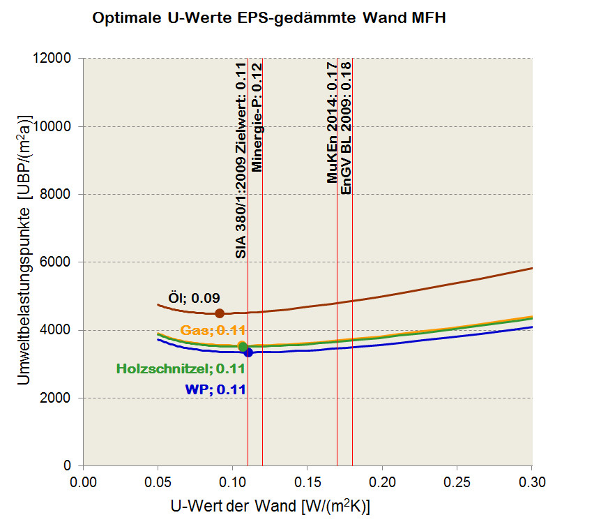 Beispielsweise wurde für ein Mehrfamilienhaus mit sechs Wohneinheiten in Zürich, Innentemperatur 20°C, Dämmung mit EPS, Lebensdauer der Wärmedämmung 40 Jahre, Erdsonden-Wärmepumpe (Jahresarbeitszahl = 3,9 (Effizienz der Wärmepumpe)) und dem heutigen CH-Verbrauchermix für Strom eine optimale Dämmdicke bezüglich Umweltbelastungspunkten von 0,26 m (U=0,11 W/m2K) bestimmt. U=Wärmedurchgangswiderstand, je kleiner der Wert, umso besser die gedämmte Wand. Wird das Gebäude mit einem Heizölkessel betrieben, so liegt das Optimum bei 0,32 m (U= 0,09 W/m2K).