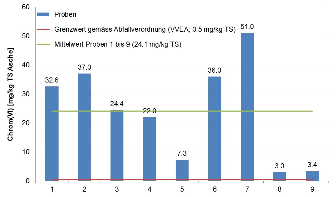 Mit der zunehmenden Bedeutung von privaten und gewerblichen Holzfeuerungen gelangen immer mehr Aschen zur Ablagerung auf die kantonale Deponieanlage Elbisgraben bei Liestal. In diesem Zusammenhang wurde die Schadstoffbelastung der Aschen systematisch untersucht. Die Ergebnisse zeigen, dass die Aschen nahezu aller Feuerungsanlagen – losgelöst vom Brennstoffmix und dem Ofentyp – die Grenzwerte für Chrom(VI) massiv überschreiten (siehe untenstehende Grafik). Bei Chrom(VI) handelt es sich um die oxidierte Form des chemischen Elements Chrom. Chrom(VI) ist giftig und gut wasserlöslich und muss somit als sehr umweltschädlich eingestuft werden.