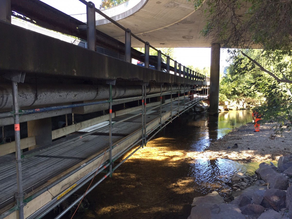 Unter der Brücke wiederum fliesst die Ergolz. Zum einen ist bei Arbeiten in der Nähe von Gewässern immer darauf zu achten, dass diese nicht verschmutzt werden, umgekehrt kann sich der Fluss bei Hochwasser zu einer ernsthaften Gefahr für die Arbeiter entwickeln. Aus diesem Grund werden während den Arbeiten die Wasserpegel der Ergolz sowie die Wetterentwicklung beobachtet. So könnte die Baustelle unter der Brücke rechtzeitig geräumt werden.