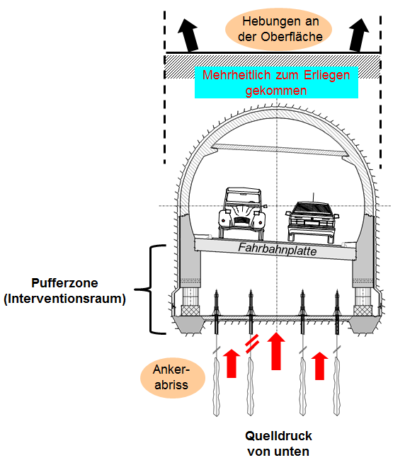 Hier befindet sich jeweils eine Pufferzone unter der Fahrbahn. In dieser wird, durch verschiedene Massnahmen verhindert, dass die Tunnelröhre nach oben gedrückt und damit der Fahrraum zerstört wird.
