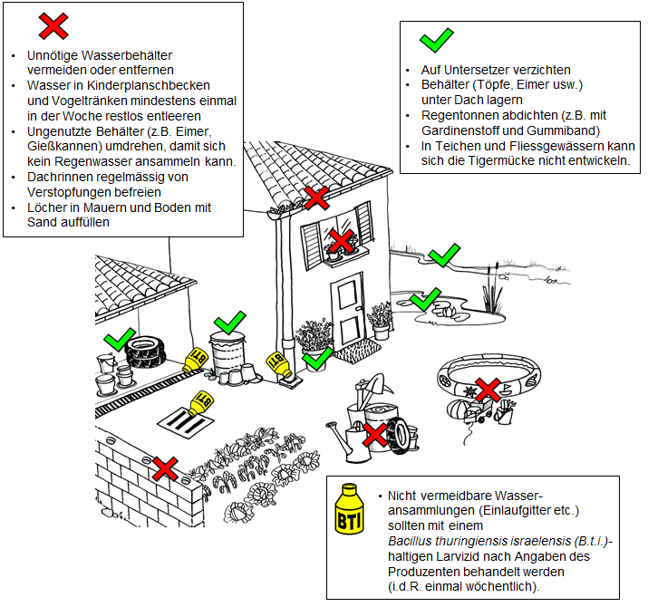 Jede kleinere Wasseransammlung ist eine potentielle Brutstätte für die Tigermücke. Bevorzugt werden beispielsweise Regentonnen oder Abflussdolen. In Teichen und Flüssen sind Tigermückeneier selten. Ein Tigermücken-Weibchen klebt im Verlauf ihres einmonatigen Lebens hunderte Eier knapp über die Wasseroberfläche. Die Eier sind mehrere Monate trockenresistent und können den Winter überdauern. Die beste Bekämpfung besteht in der Vermeidung von offenen Wasseransammlungen, indem man Regentonnen abdeckt, ungenutzte Behälter umdreht und das Wasser im Planschbecken regelmässig wechselt. Nicht vermeidbare Wasseransammlungen (z.B. Abflussdolen) können mit ökologisch unbedenklichen Larviziden mindestens alle 14 Tage behandelt werden. Auf der kantonalen Neobiota-Website ist ein Merkblatt mit weiterführenden Informationen zur Bekämpfung der Tigermücke sowie deren Identifikationsmerkmalen abrufbar.